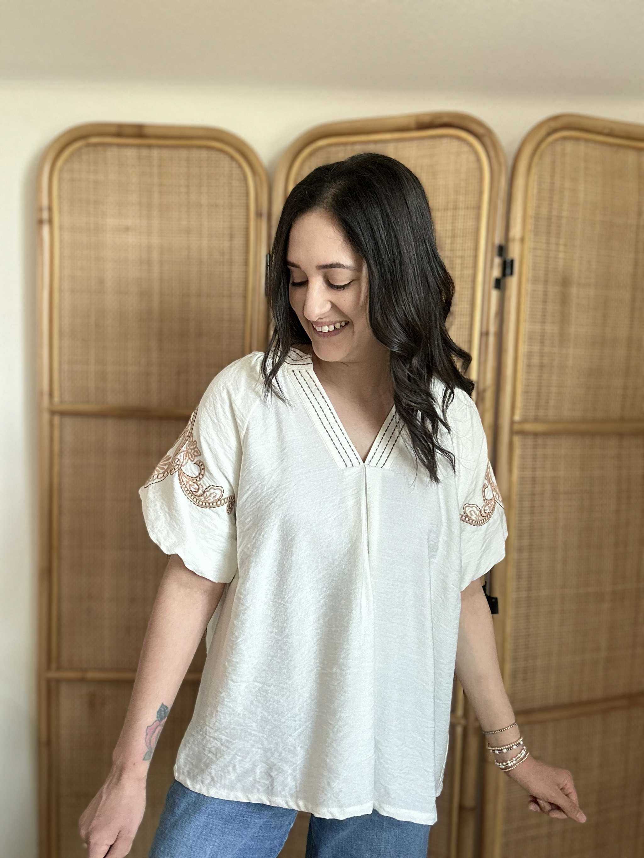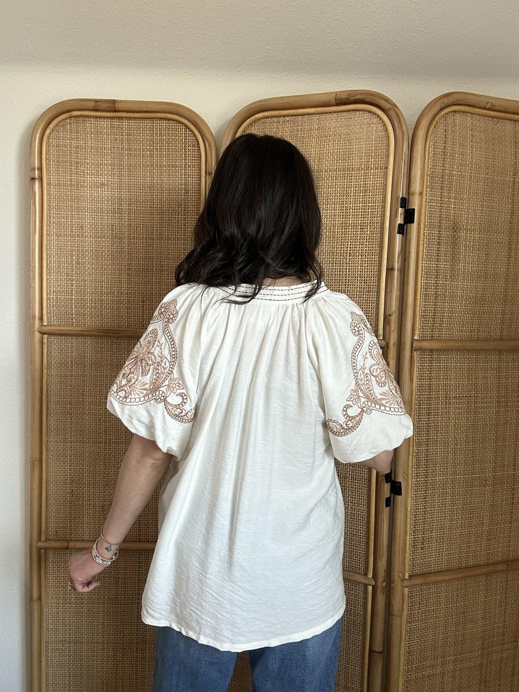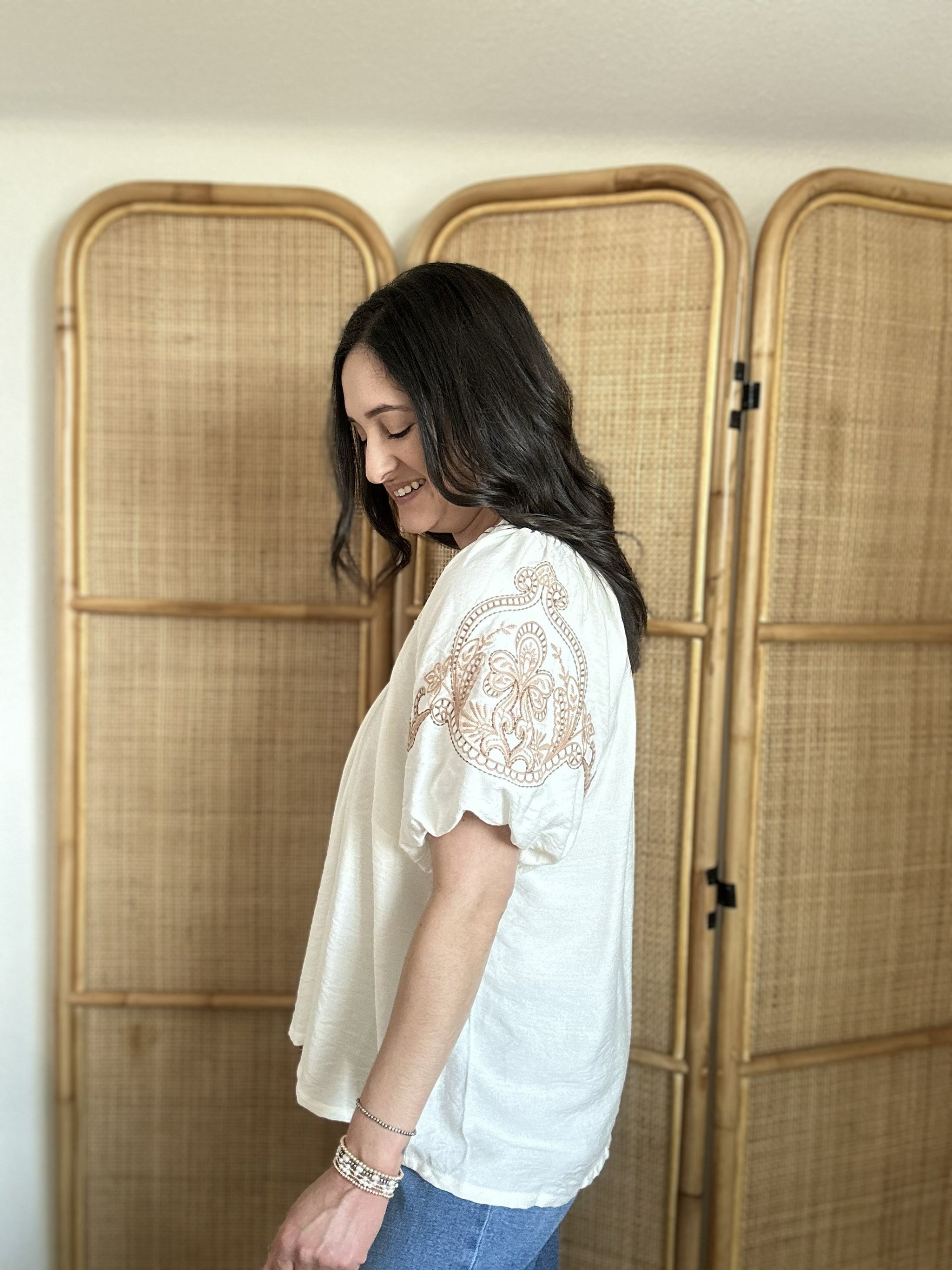 Soft, feminine, and beautifully detailed, the Seek Me Out Top is a versatile piece you'll reach for again and again. This embroidered puff sleeve top features a flattering V-neckline and charming short puff sleeves adorned with delicate embroidery. The lightweight, flowy fabric drapes beautifully for an effortlessly chic look. Pair it with denim for a casual everyday outfit or dress it up for a night at the rodeo.
