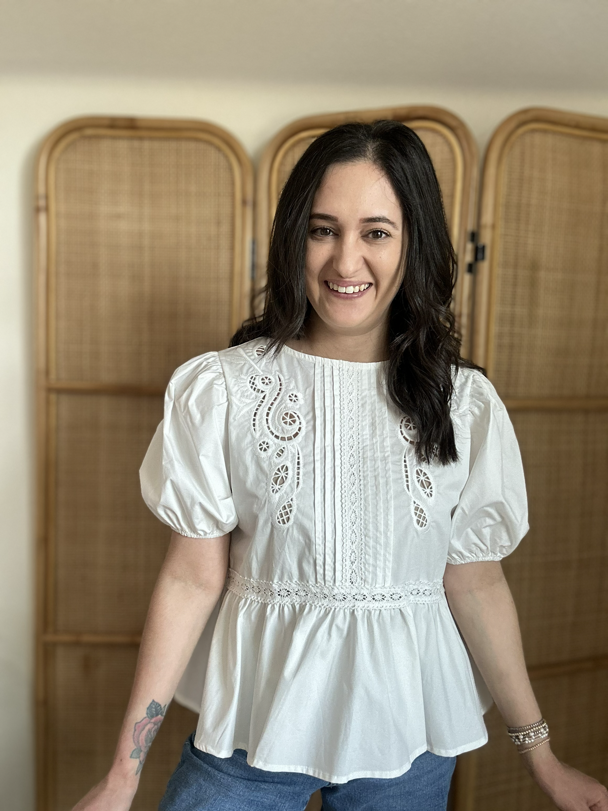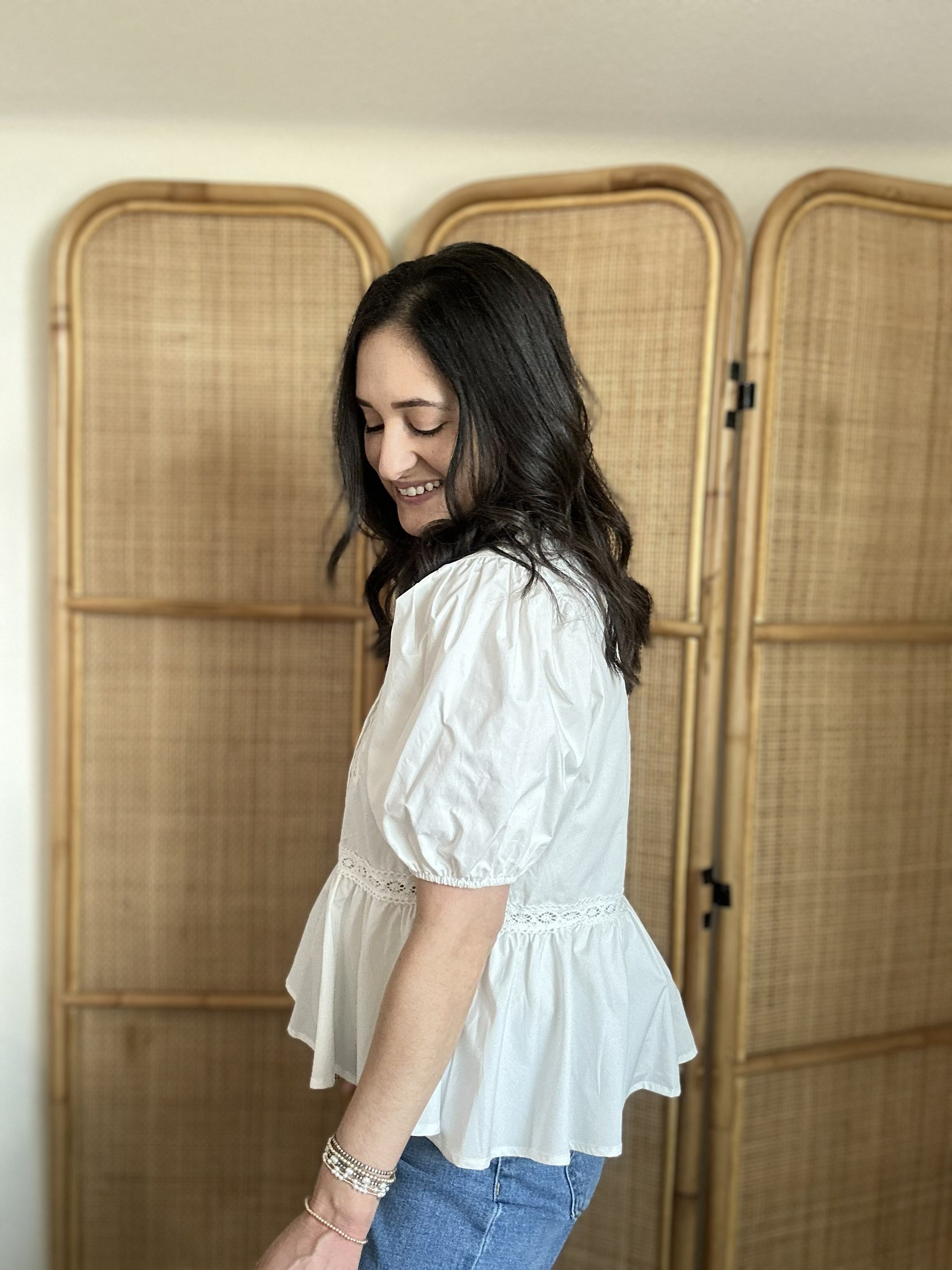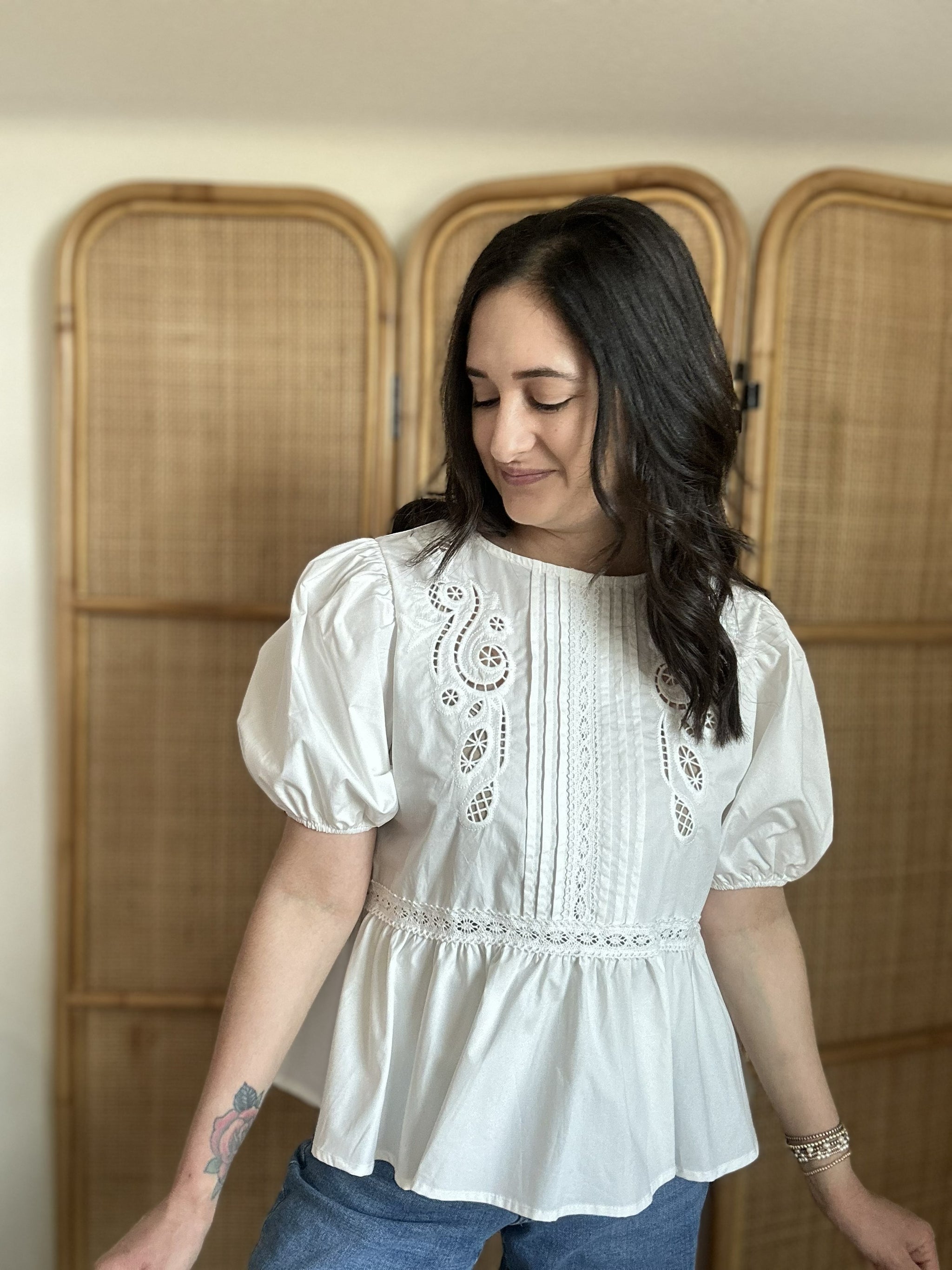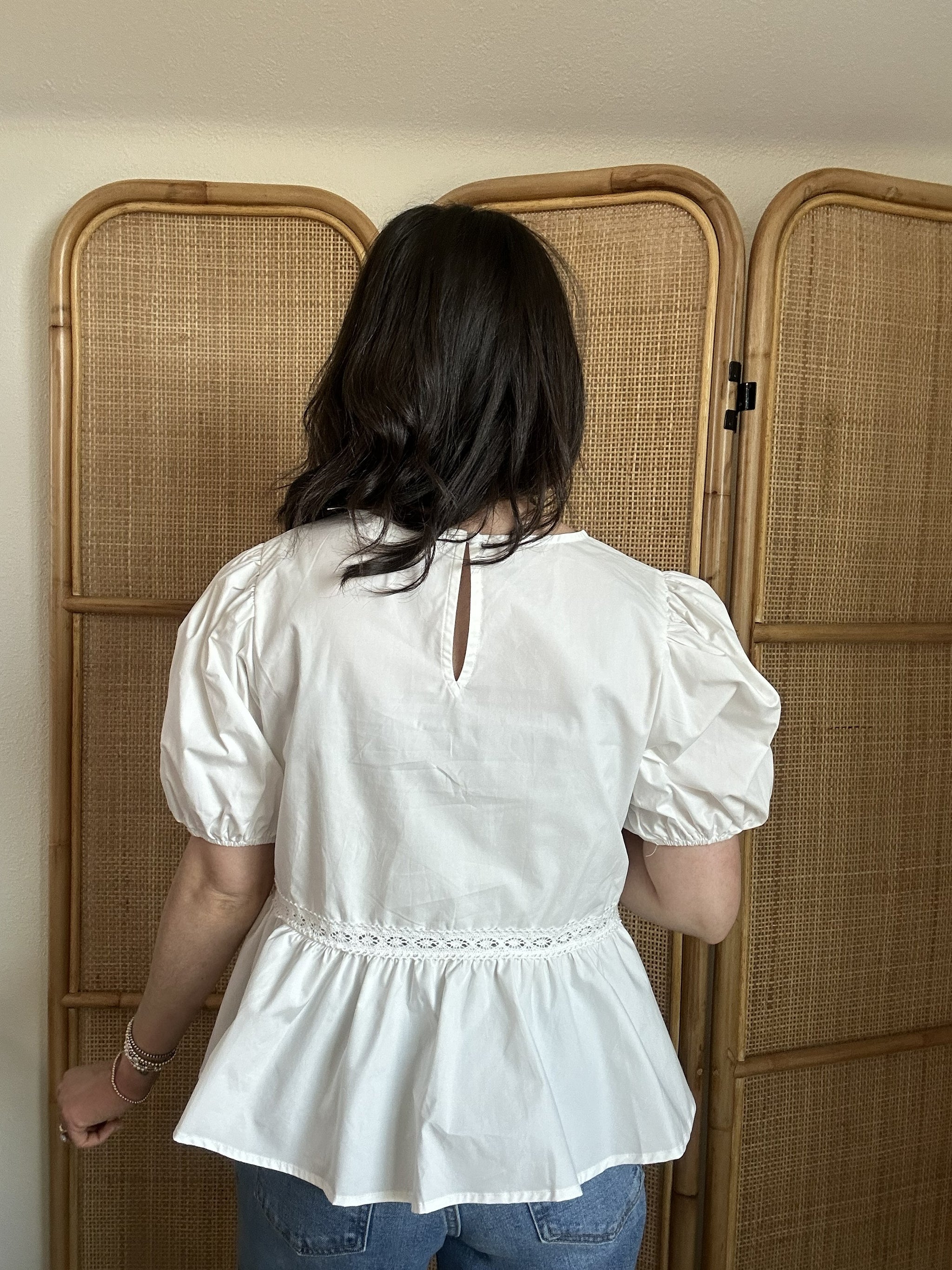 Delicate, romantic, and effortlessly charming, the Free As A Bird Top is a beautiful addition to your wardrobe. This solid woven top features a round neckline and short puff sleeves, with stunning embroidered front detailing accented by pintuck and lace for a feminine touch. The flattering peplum silhouette and back neck button closure add elegant finishing details. Crafted from soft cotton, it's perfect for everything from casual weekends to dressed-up occasions.