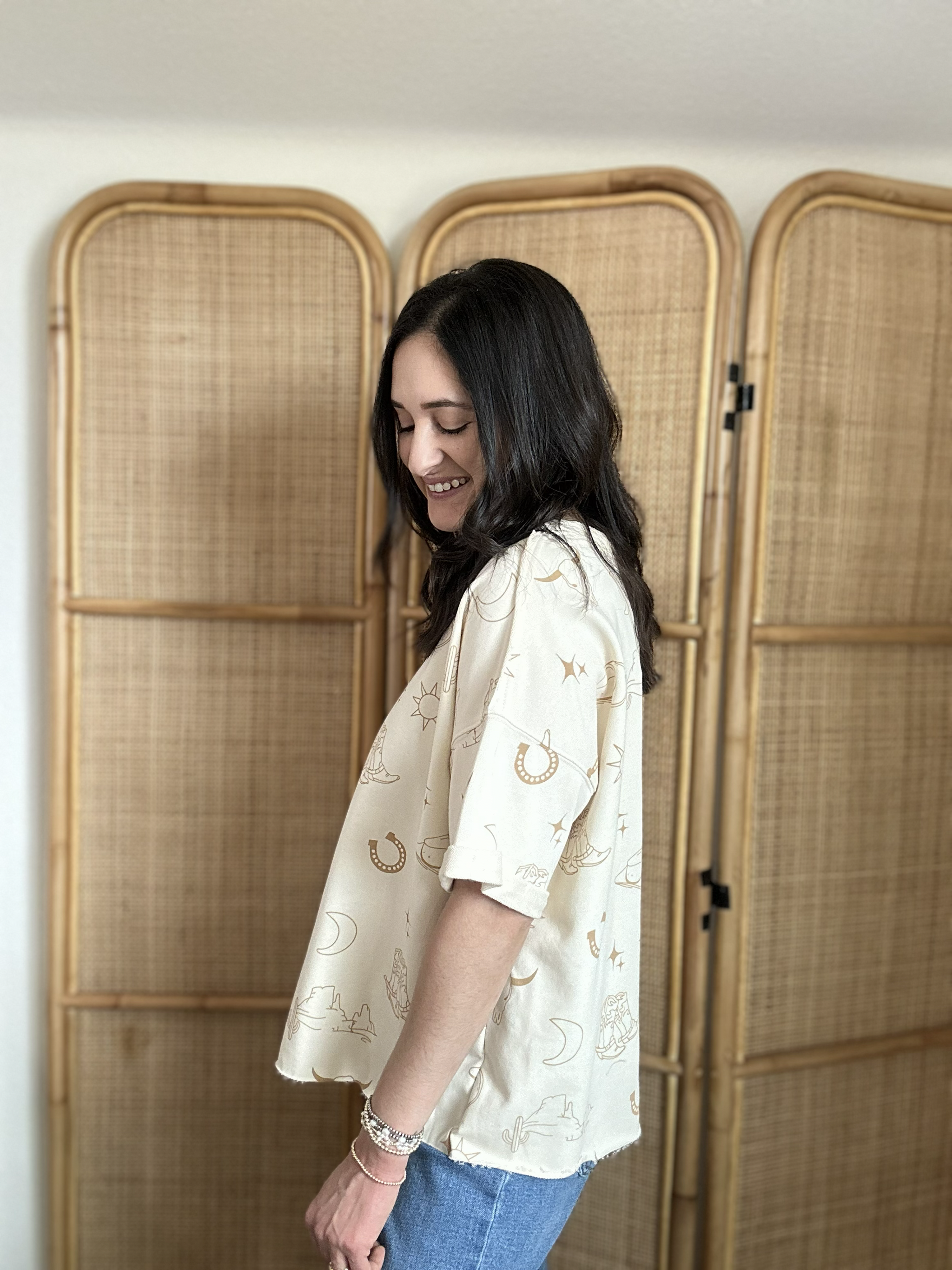 For the girls who feel most at home under wide open skies, the All Things Cowgirl Top is that easy, throw-on-and-go piece you'll reach for on repeat. With its lightweight sweatshirt feel and relaxed fit, it gives you that laid-back western vibe without trying too hard. Soft, breathable, and perfectly broken-in, this one was made for rodeo nights, road trips, and everyday life under the sun. Featuring an all-over western icon print with boots, horseshoes, and desert scenes on a neutral cream base with warm tan graphics!
