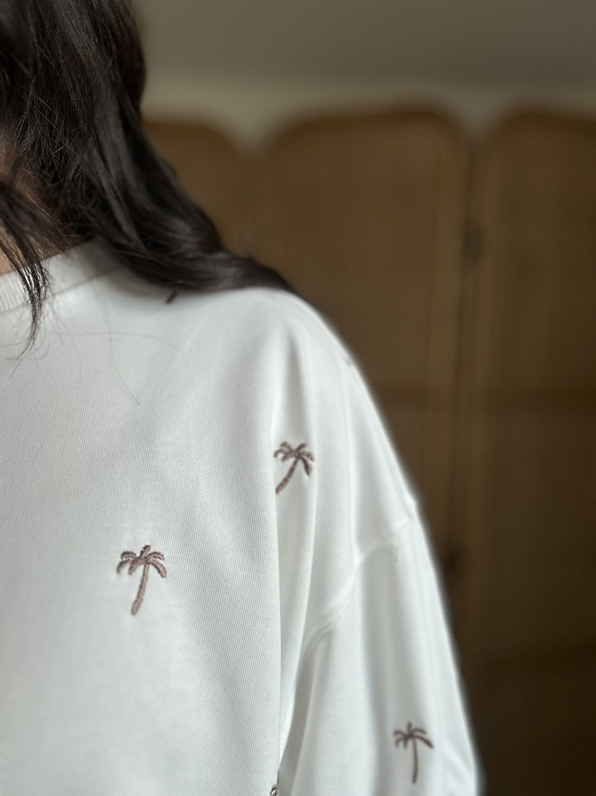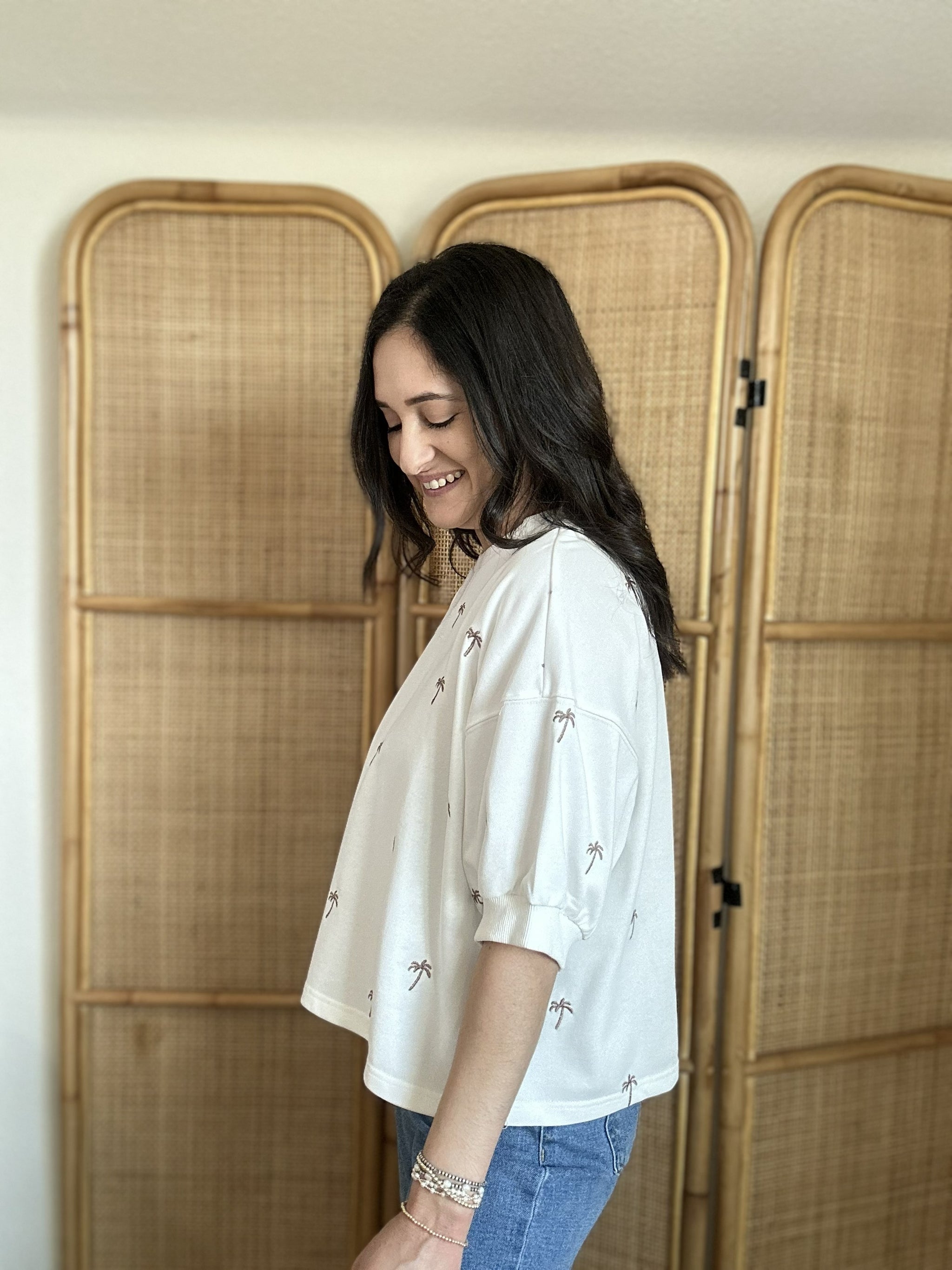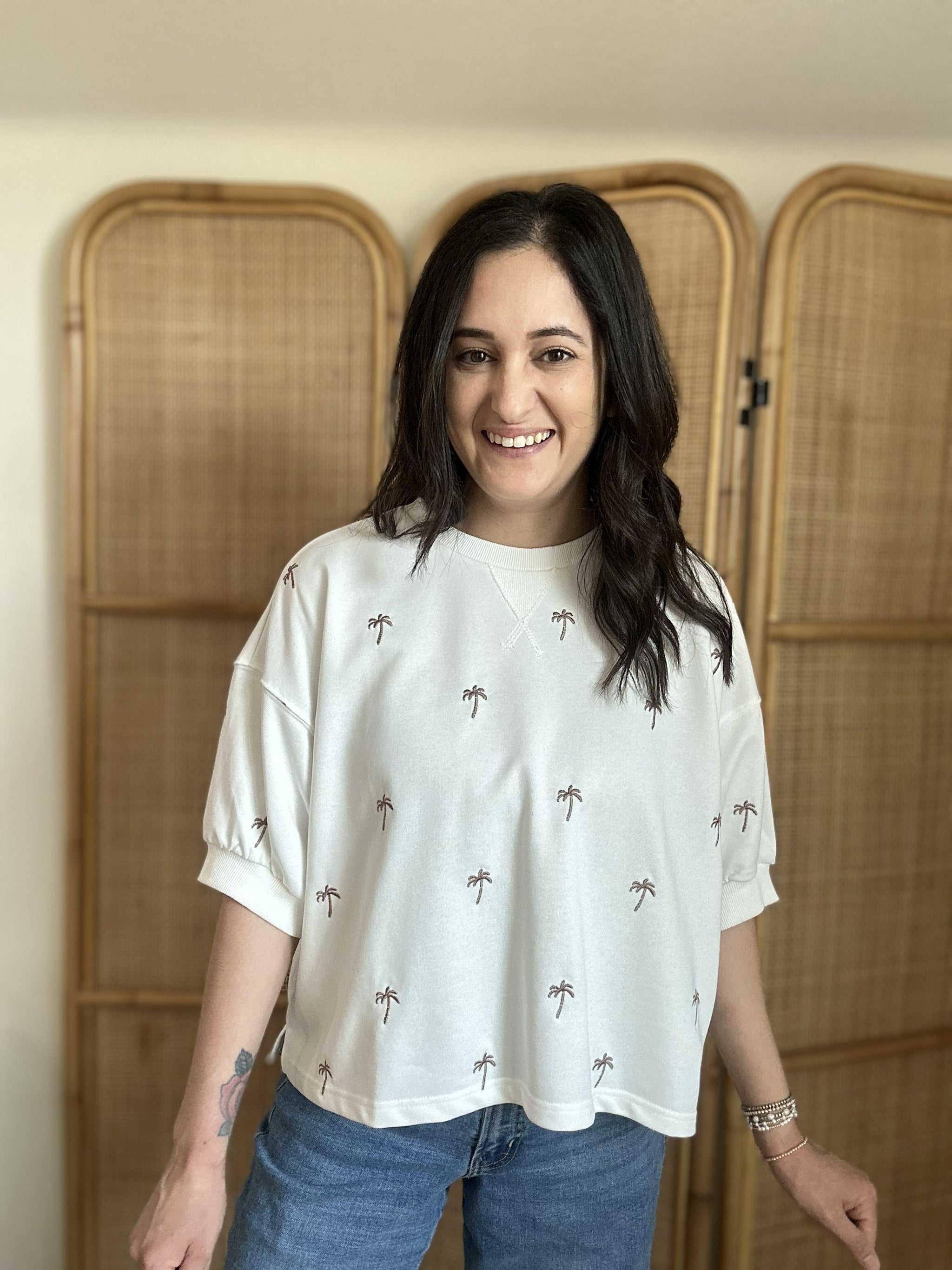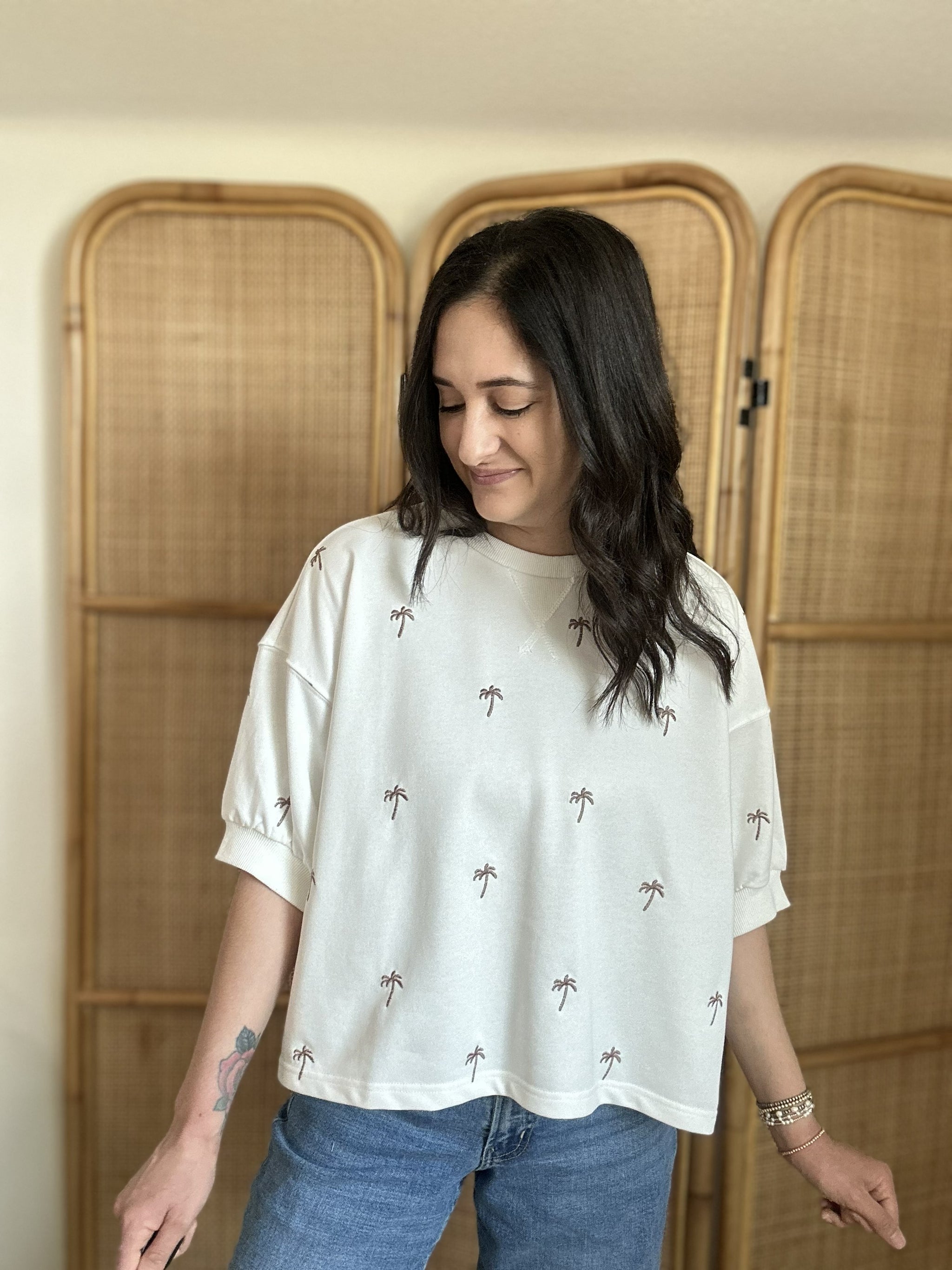 Laid-back, cool, and effortlessly stylish, the Bahama Mama Top is your new favorite sweatshirt for easy, breezy days. This white crew-neck sweatshirt features charming embroidered palm tree print that brings tropical vibes to your wardrobe. Designed with a relaxed boxy cut, it's the perfect transitional piece for any season. Pair it with denim shorts for a casual beach look or style it with your favorite denim for an easy, everyday outfit.