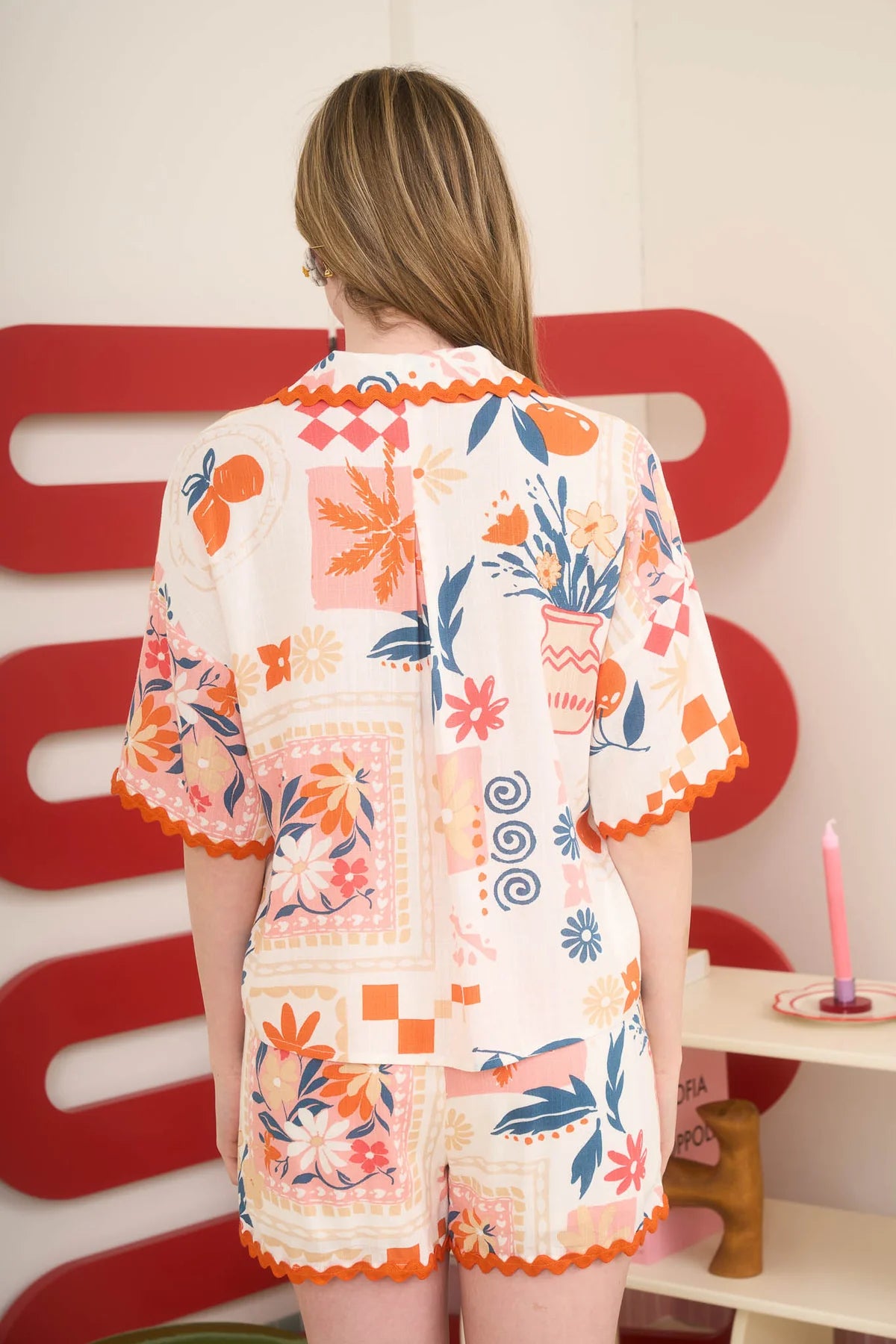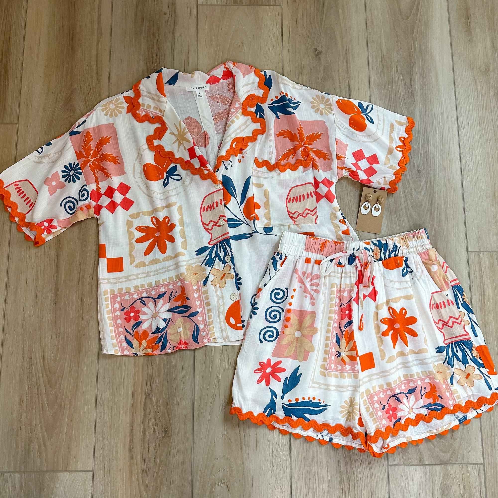 Bright, breezy, and full of fun—this fruit and floral printed set was made for summer. The collared button-up top features short sleeves, a relaxed drop shoulder, a chest pocket, and contrast wavy trim for a playful finish. The matching shorts have an elastic waistband with a functional tie and are fully lined for all-day comfort. Whether you're headed to the beach or brunch, this matching set brings the sunshine.