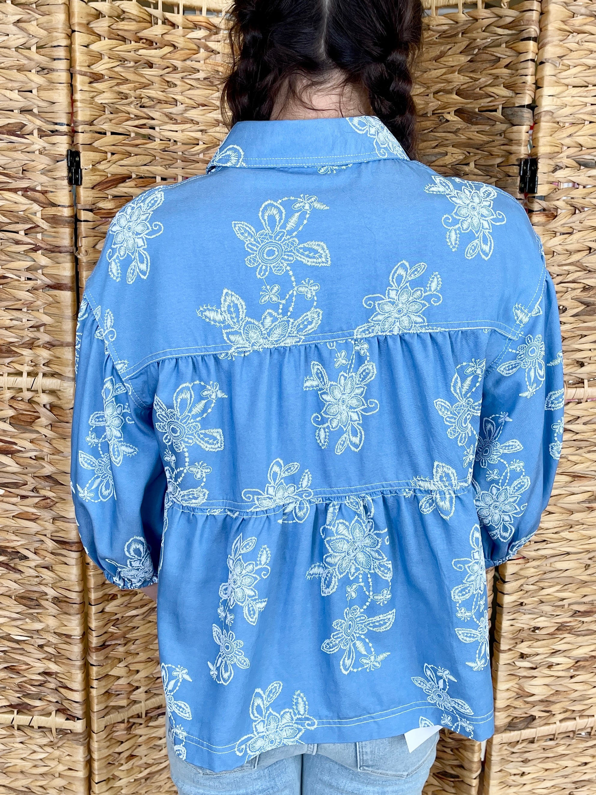 Sweet, charming, and rodeo-ready, the Daisy Mae Top is a must-have for your western wardrobe. This lightweight, textured top has the look of denim with a soft, comfortable feel. Featuring a classic collar, button-down front with cute buttons, and delicate white floral embroidery, it's the perfect blend of feminine and casual style. With short sleeves for easy wear, this top is perfect for rodeo nights, country concerts, or everyday adventures!