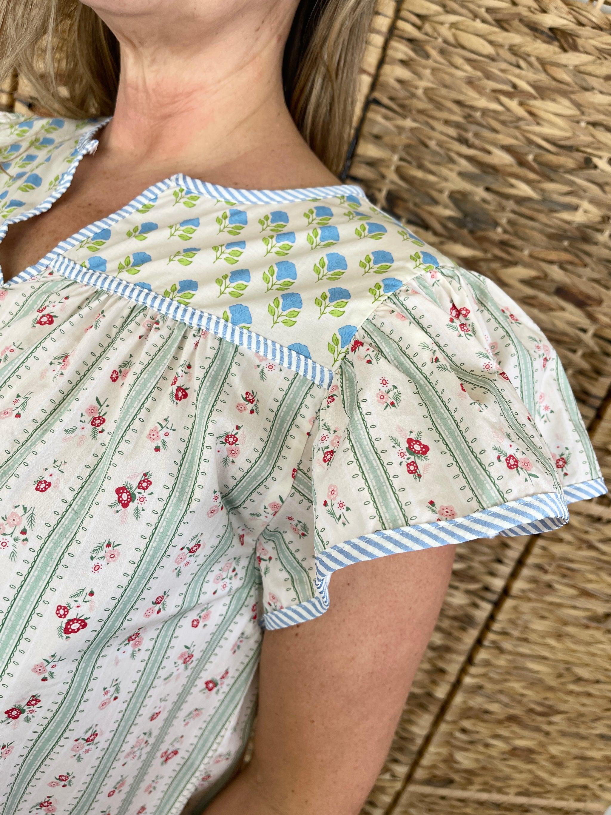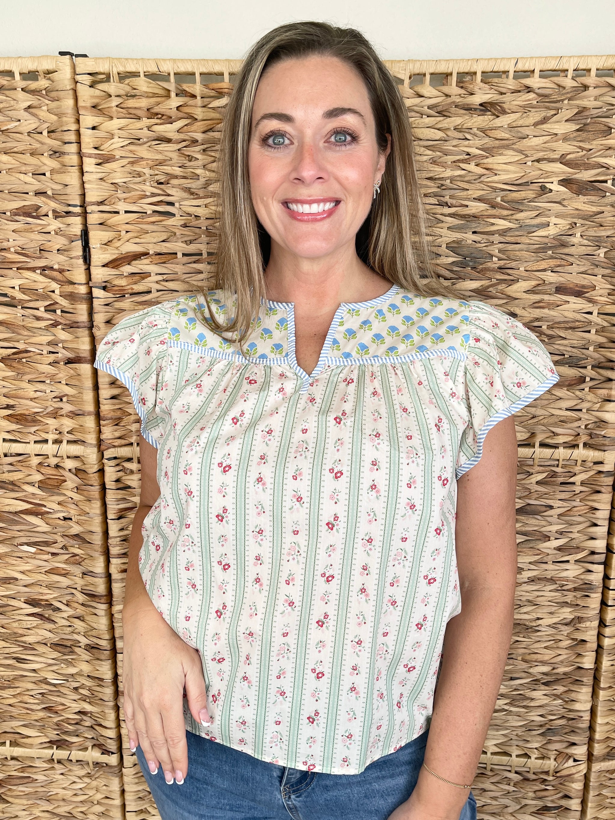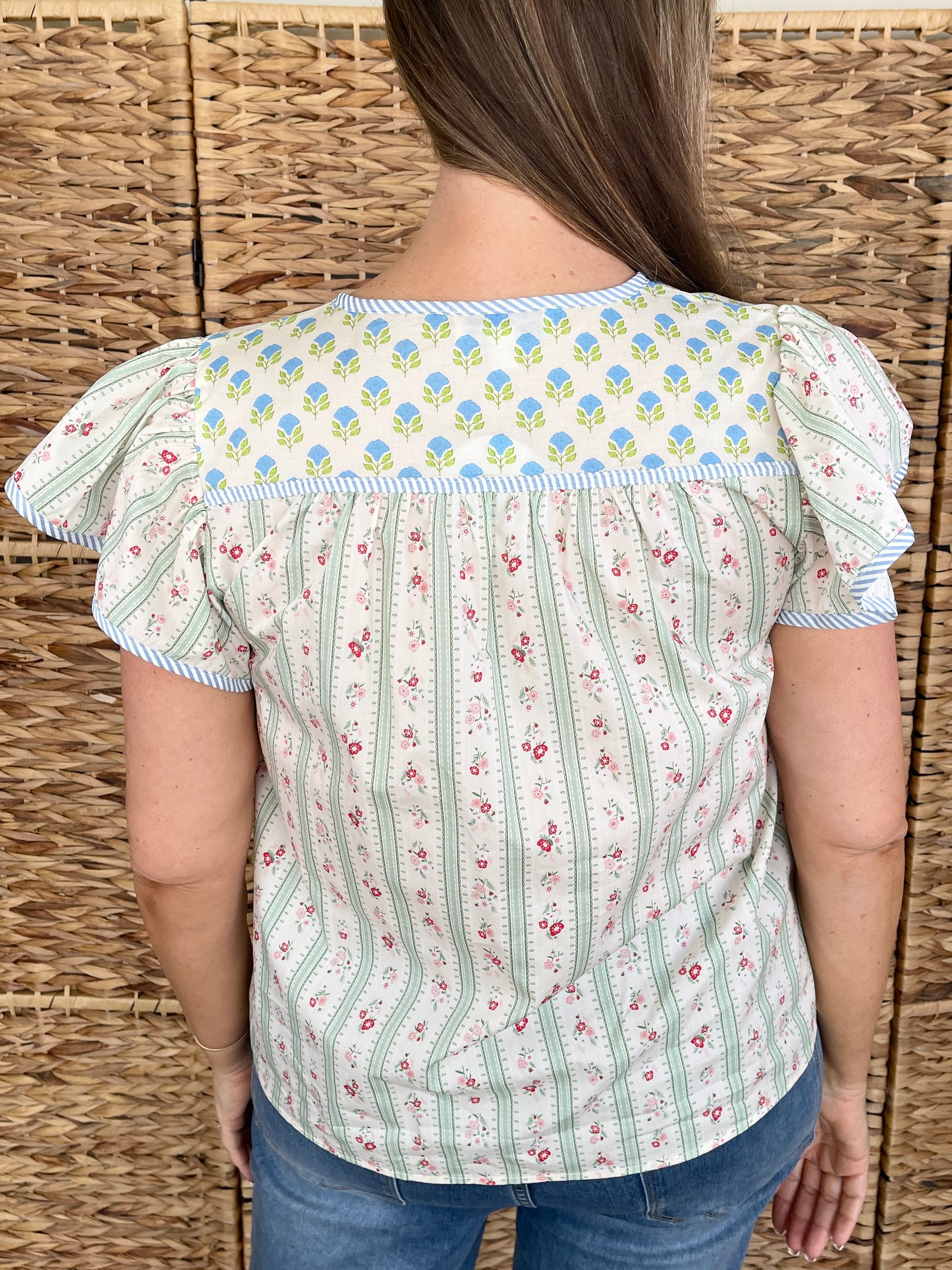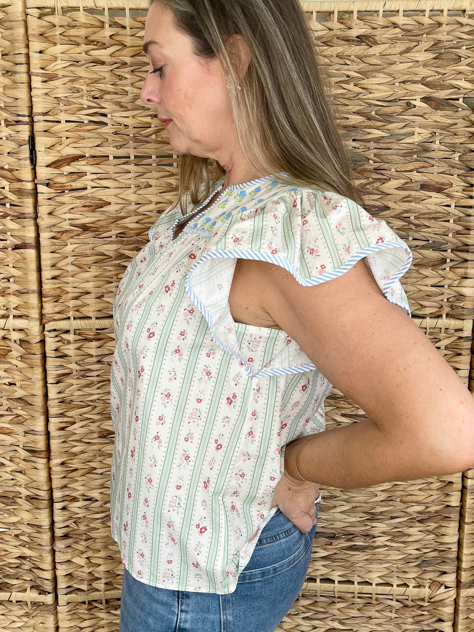 Playful, feminine, and absolutely charming, the He Loves Me He Loves Me Not Top is a delightful printed top that brings sweet, romantic style to your wardrobe. This beautiful top features flirty ruffle sleeves that add a feminine touch and a fun printed pattern that makes it a standout piece. Crafted from soft cotton, it's comfortable and breathable for all-day wear. Pair it with denim for a casual spring look or style it with white pants for a fresh, summery vibe.