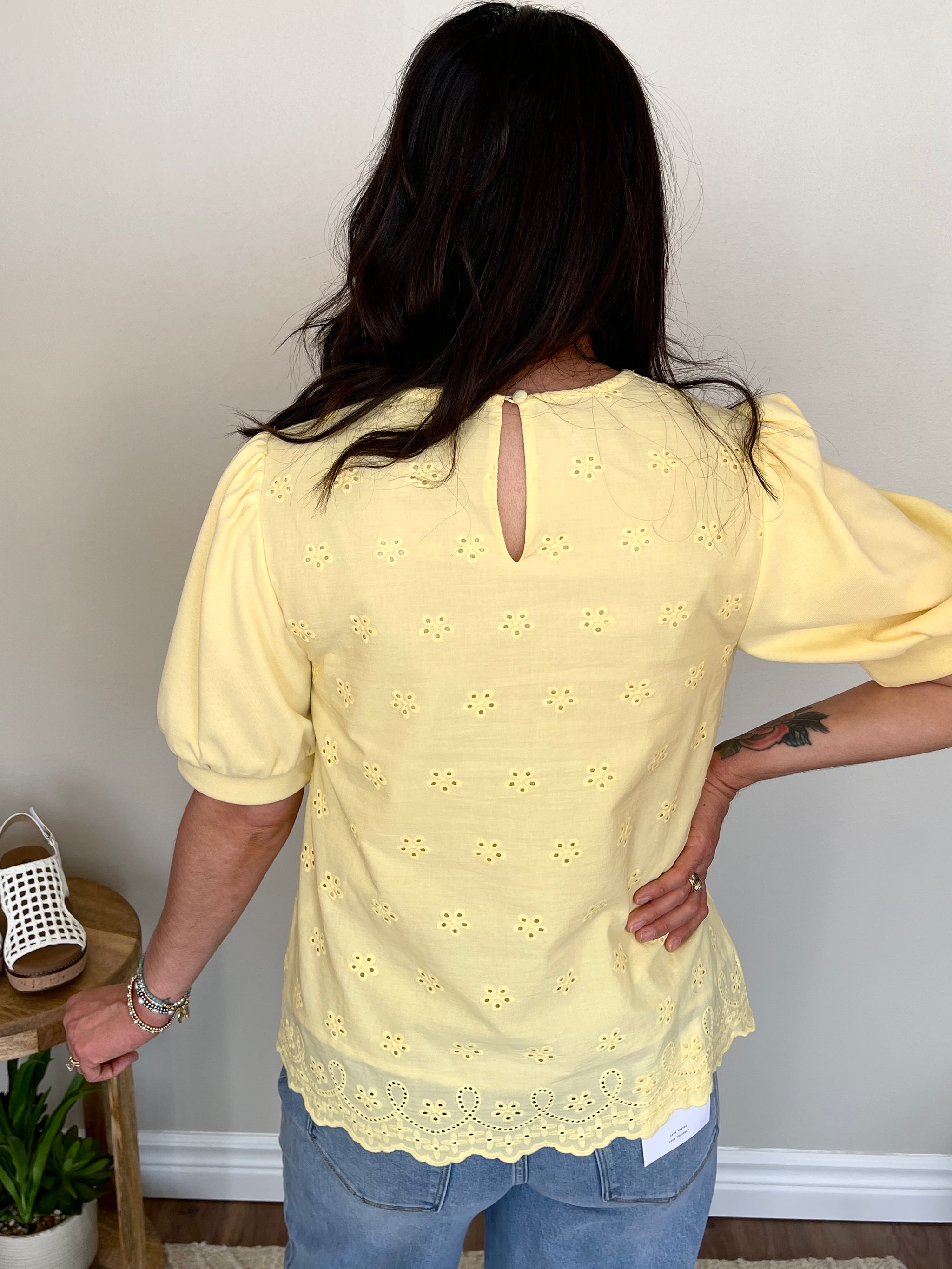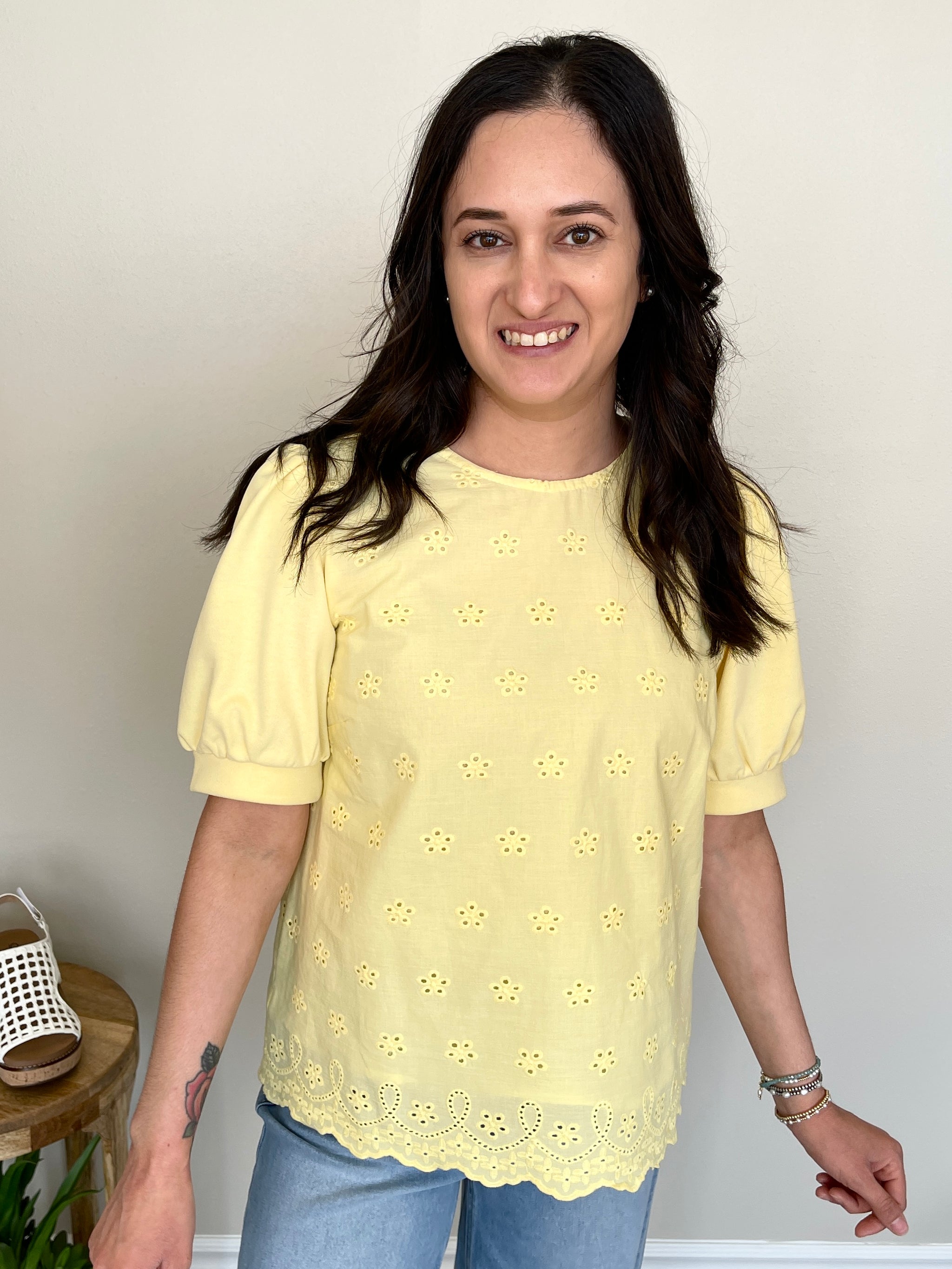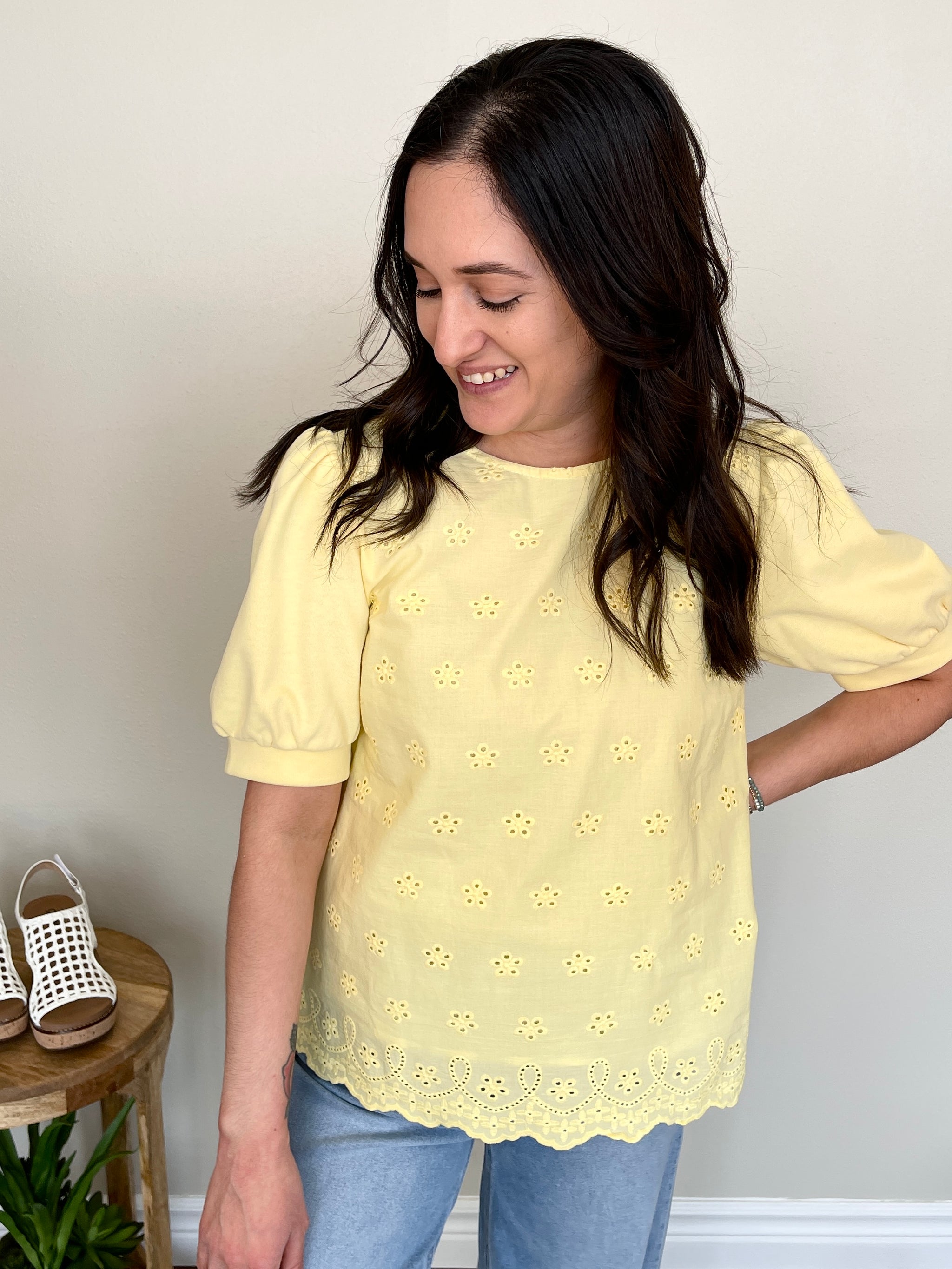 The Lemon Drop Top is sunshine in a shirt! This short sleeve yellow top features a beautiful embroidered design on both the front and back for a rich, artisan-inspired detail that makes this top truly special. Pair it with white jeans or linen trousers for a fresh, polished look, or style it with denim shorts and sandals for a casual, breezy summer outfit. Tuck it into a high waisted skirt for a feminine, elevated vibe or wear it loose for an effortless, relaxed feel. The embroidered detail makes it a standout piece that looks just as good coming as it does going!