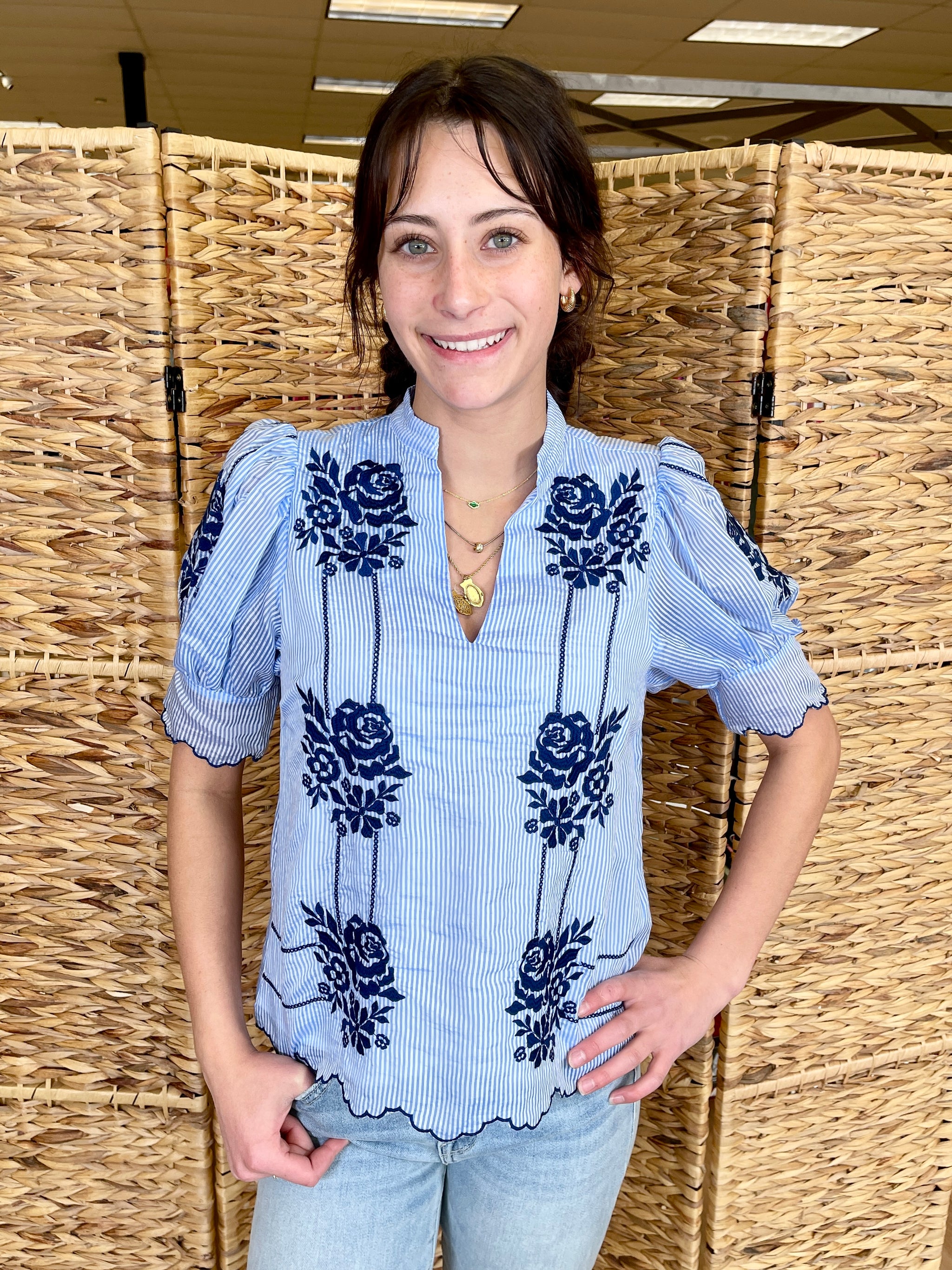 Charming, versatile, and beautifully detailed, the Little Miss Gracie Top is a wardrobe essential you'll love styling year-round. This flower embroidered striped top brings the perfect blend of feminine charm and casual style. Designed in the USA, it's ideal for creating multiple looks—pair it with denim and booties for a perfect rodeo outfit, or style it with white denim or pants for a crisp spring and summer ensemble. This top transitions effortlessly from season to season!