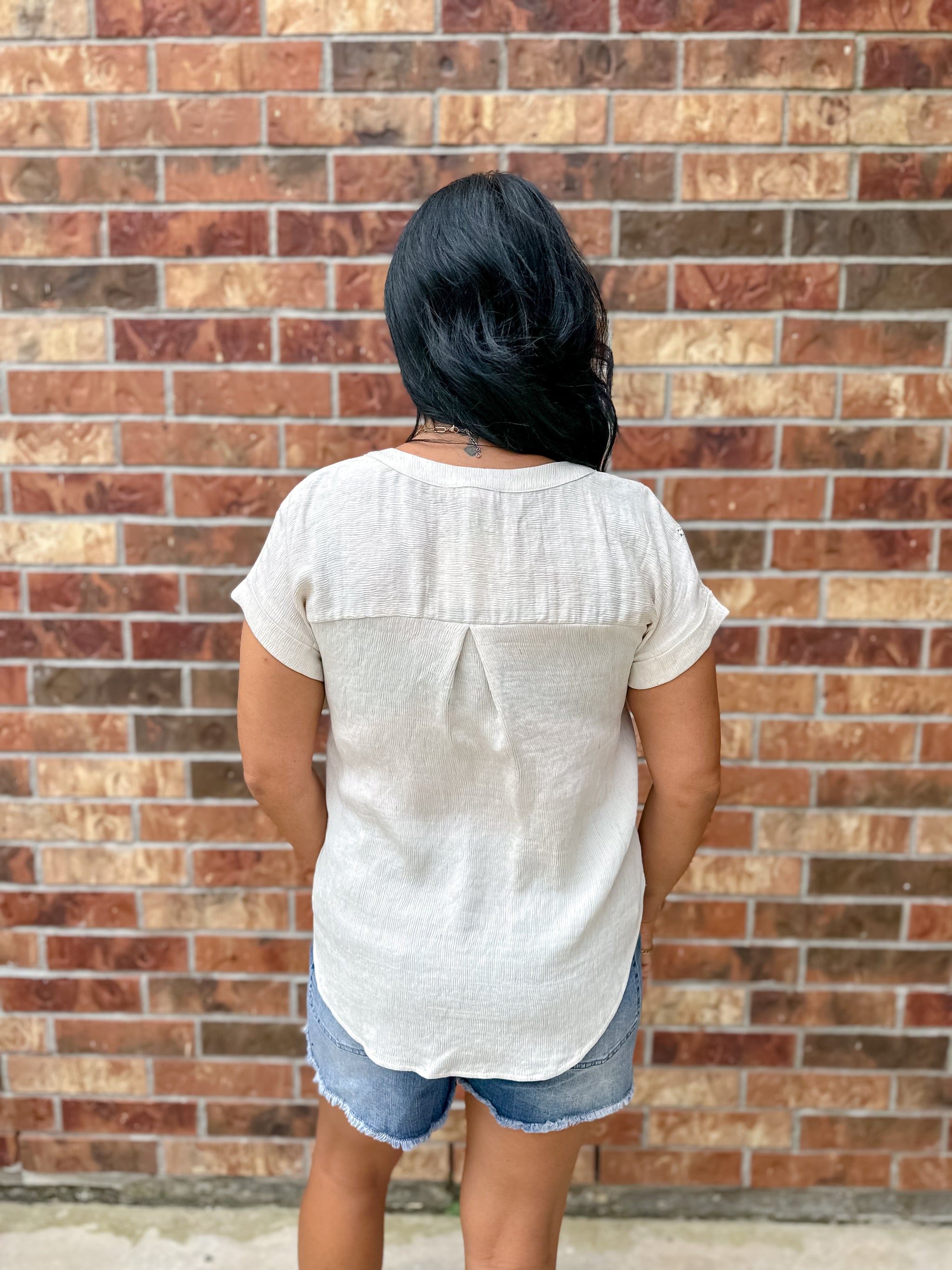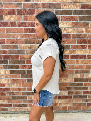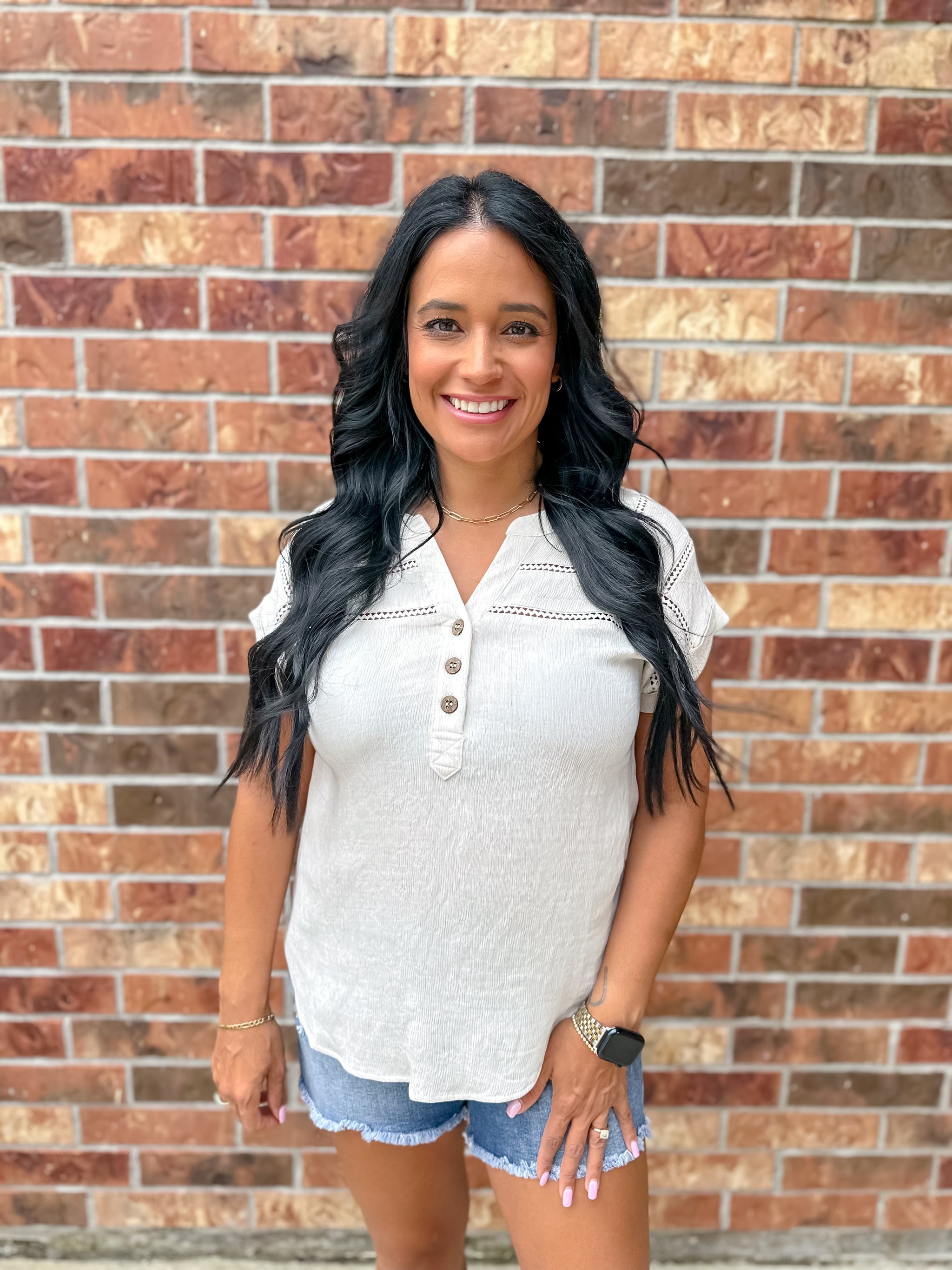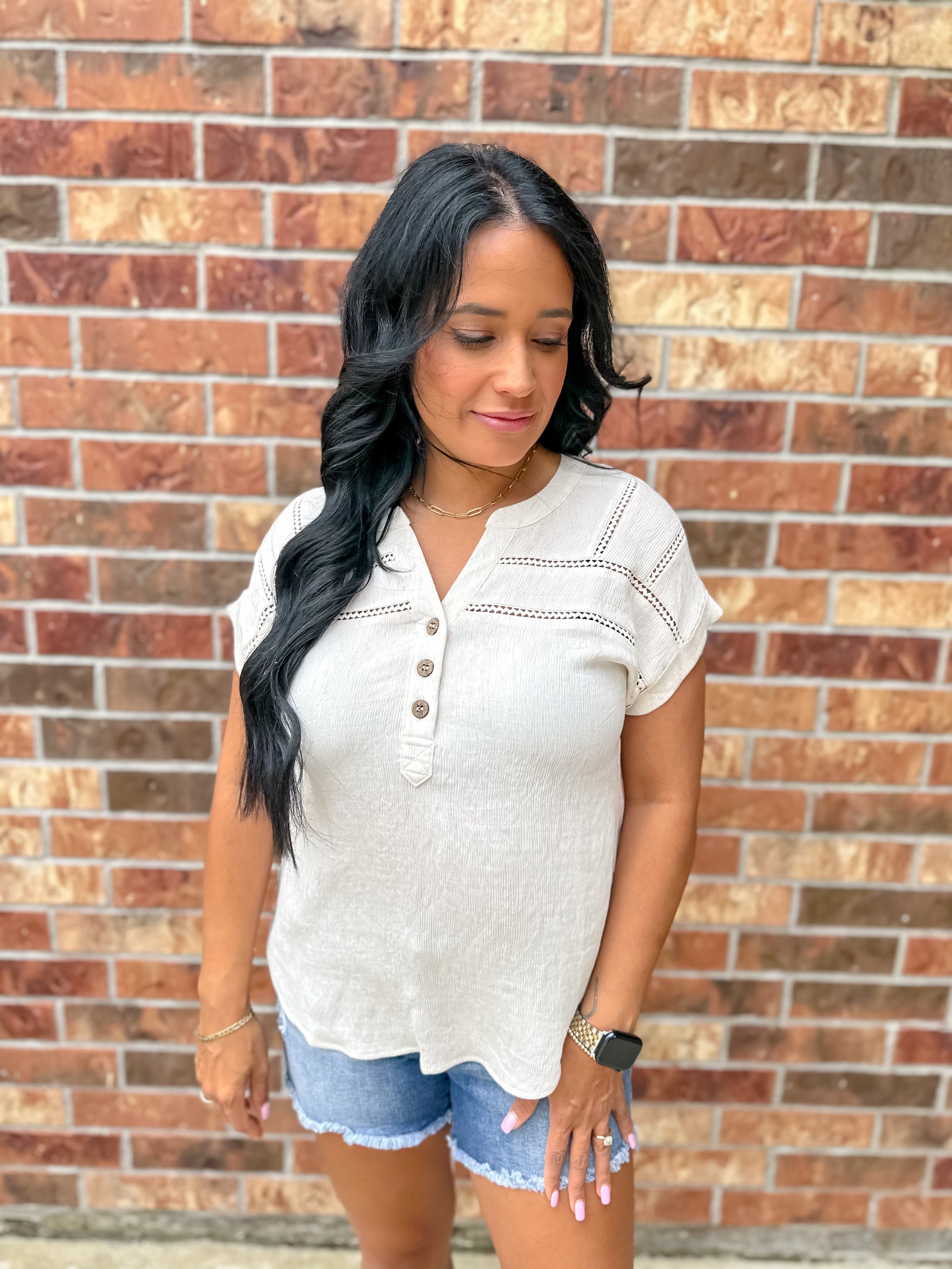 Feminine with a touch of vintage flair, The Rustic Top features a classic henley neckline, short sleeves, and bold crochet lace trim that gives it standout texture. The fabric has a naturally rustic, worn-in look that adds to its laid-back, lived-in vibe—perfect for styling with denim or cutoffs all season long.