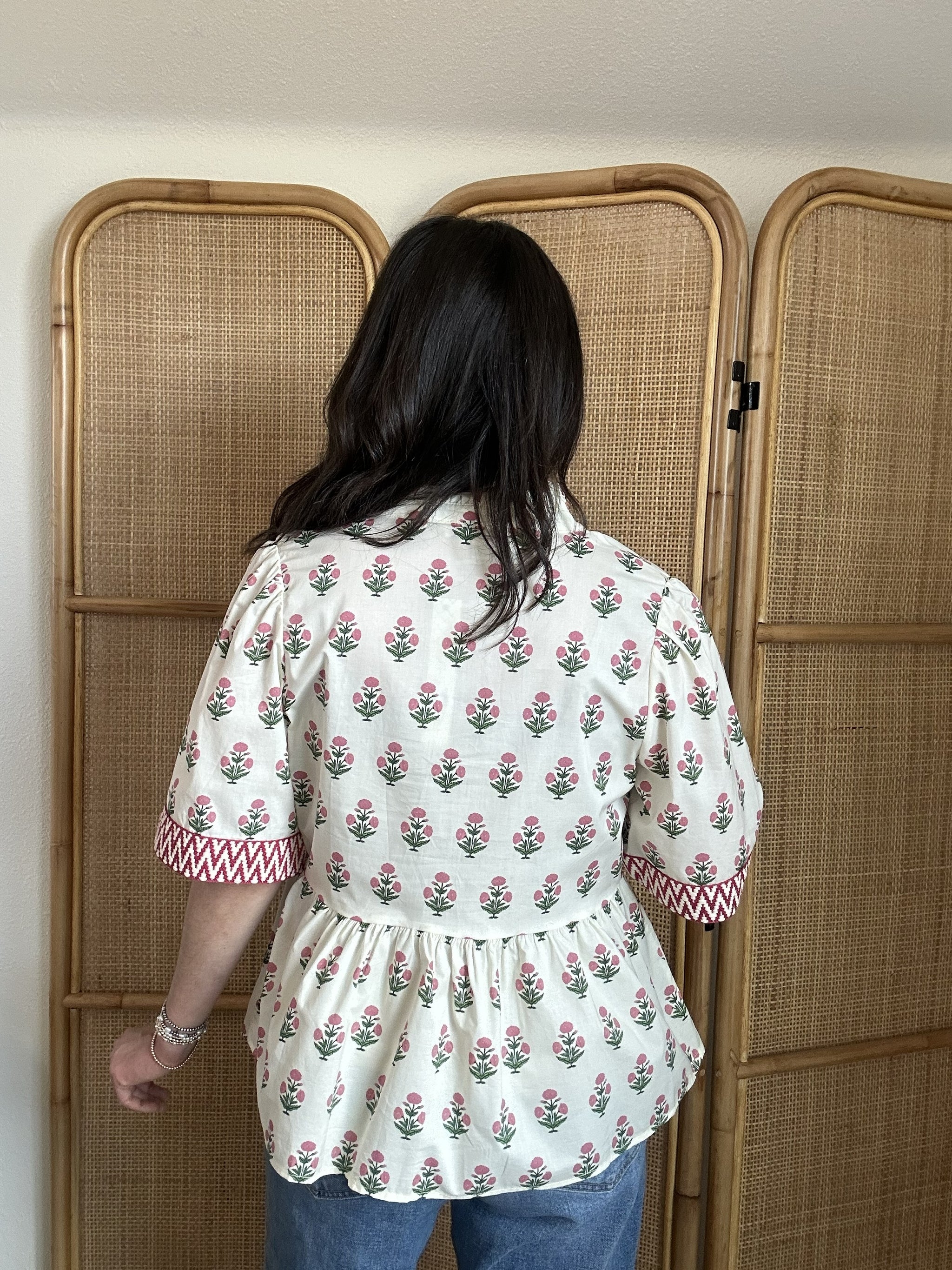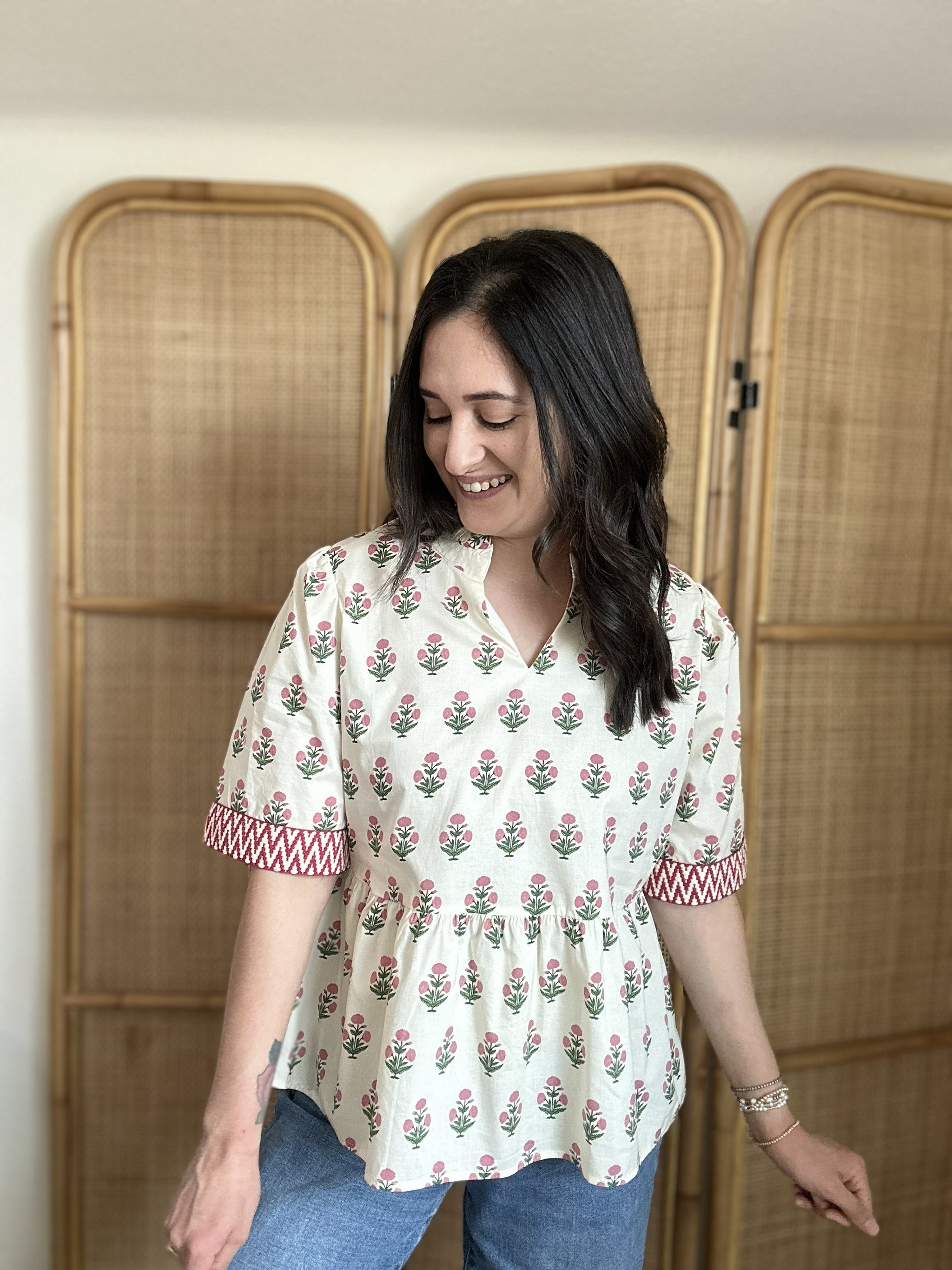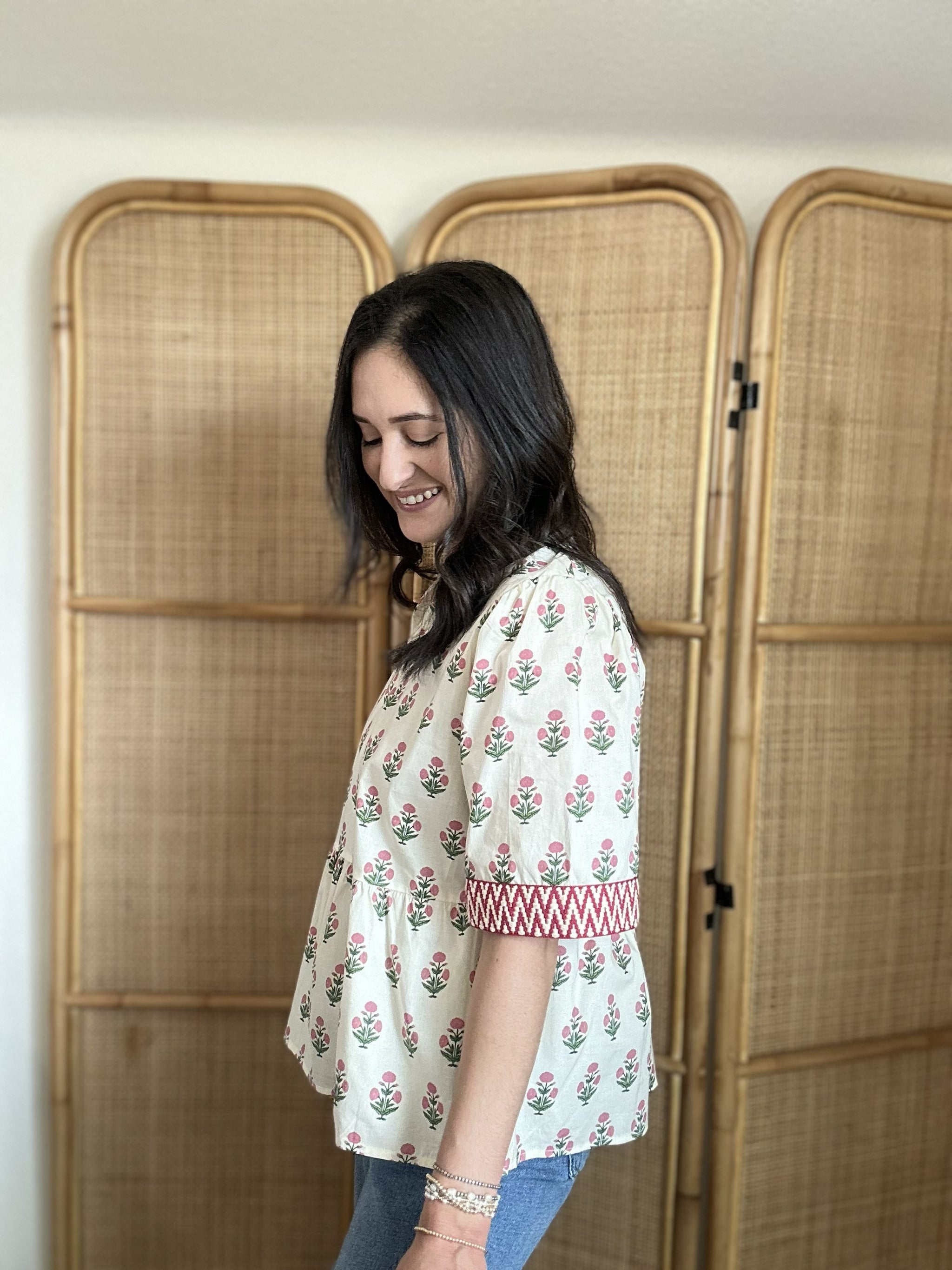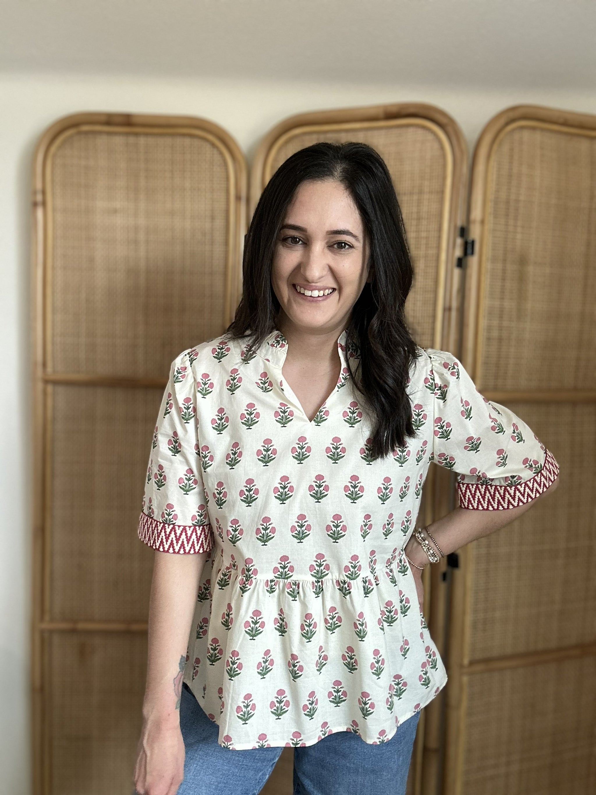 Stylish, versatile, and beautifully detailed, the Vee-Ann Top is a wardrobe essential you'll love wearing season after season. This half sleeve woven print top features charming trim detail on the sleeve hem that adds a polished finishing touch. Crafted from soft cotton with a fully lined interior, it offers comfort and quality in every wear. The eye-catching print makes it easy to style with everything from denim to shorts for a fresh, put-together look.