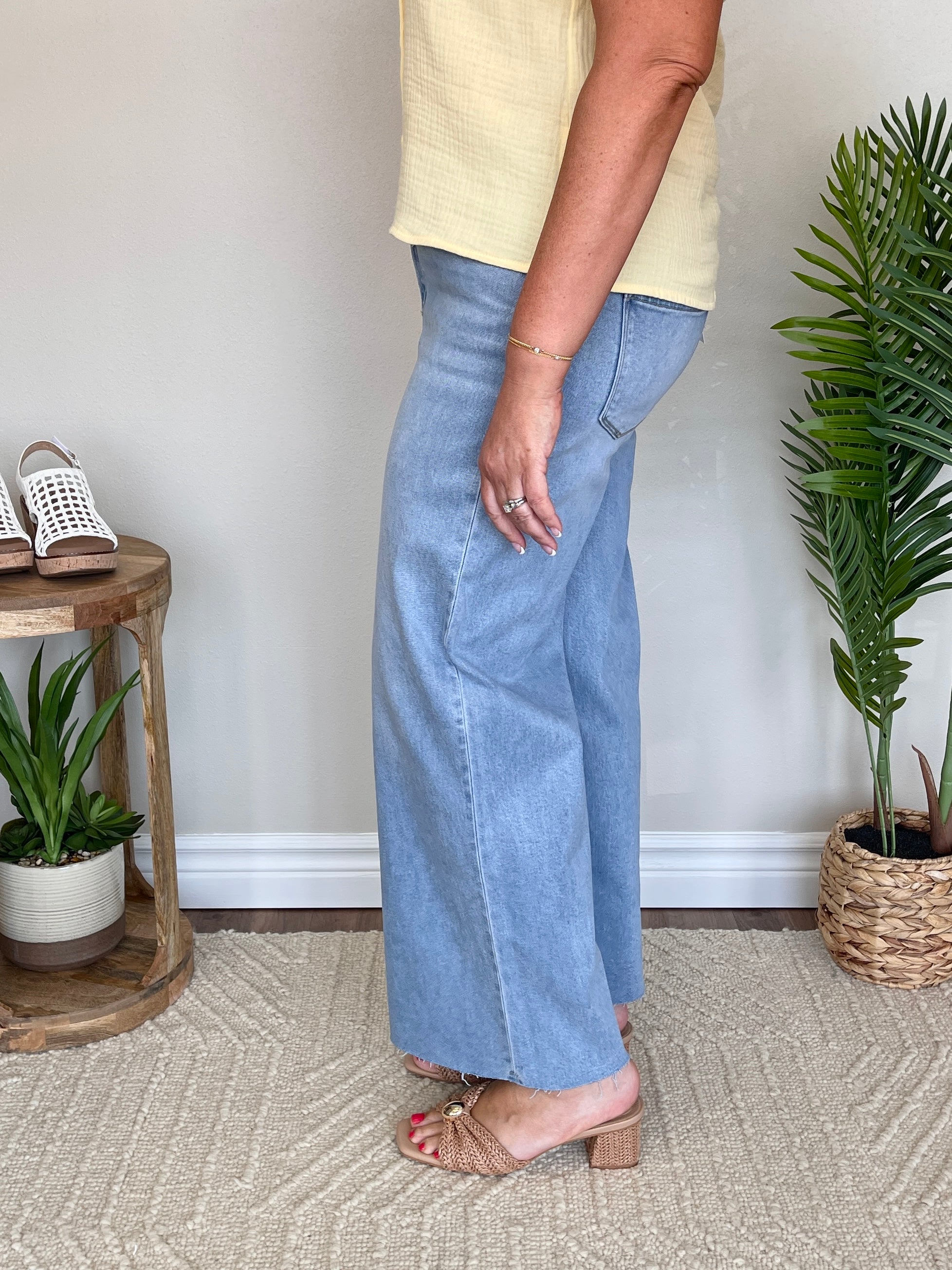 The Vervet High Rise Raw Hem Ankle Wide Jeans are the denim upgrade your wardrobe has been waiting for! These light washed wide leg jeans hit at the ankle with a raw hem finish for a cool, effortless edge. The high rise waist is flattering and comfortable, making them easy to style from morning to night. Pair them with a tucked in blouse or fitted top and heels for a polished, put together look, or style them with a casual tee and sneakers for an effortless everyday outfit. They look amazing with a flowy top or a cropped jacket for a trendy, fashion forward ensemble. These jeans are a true wardrobe staple!