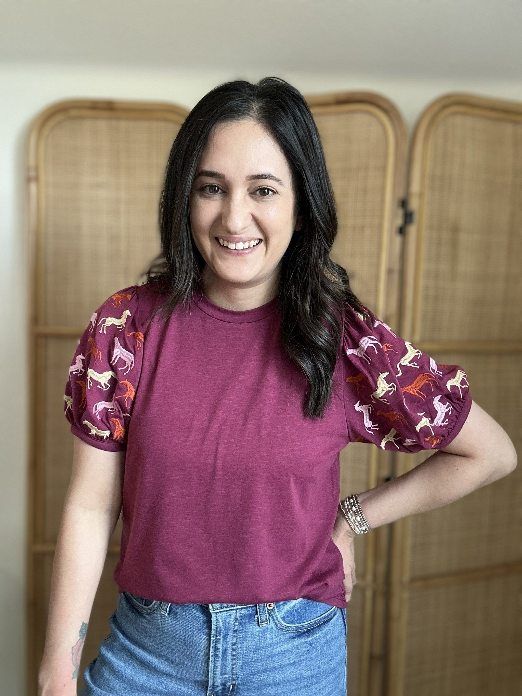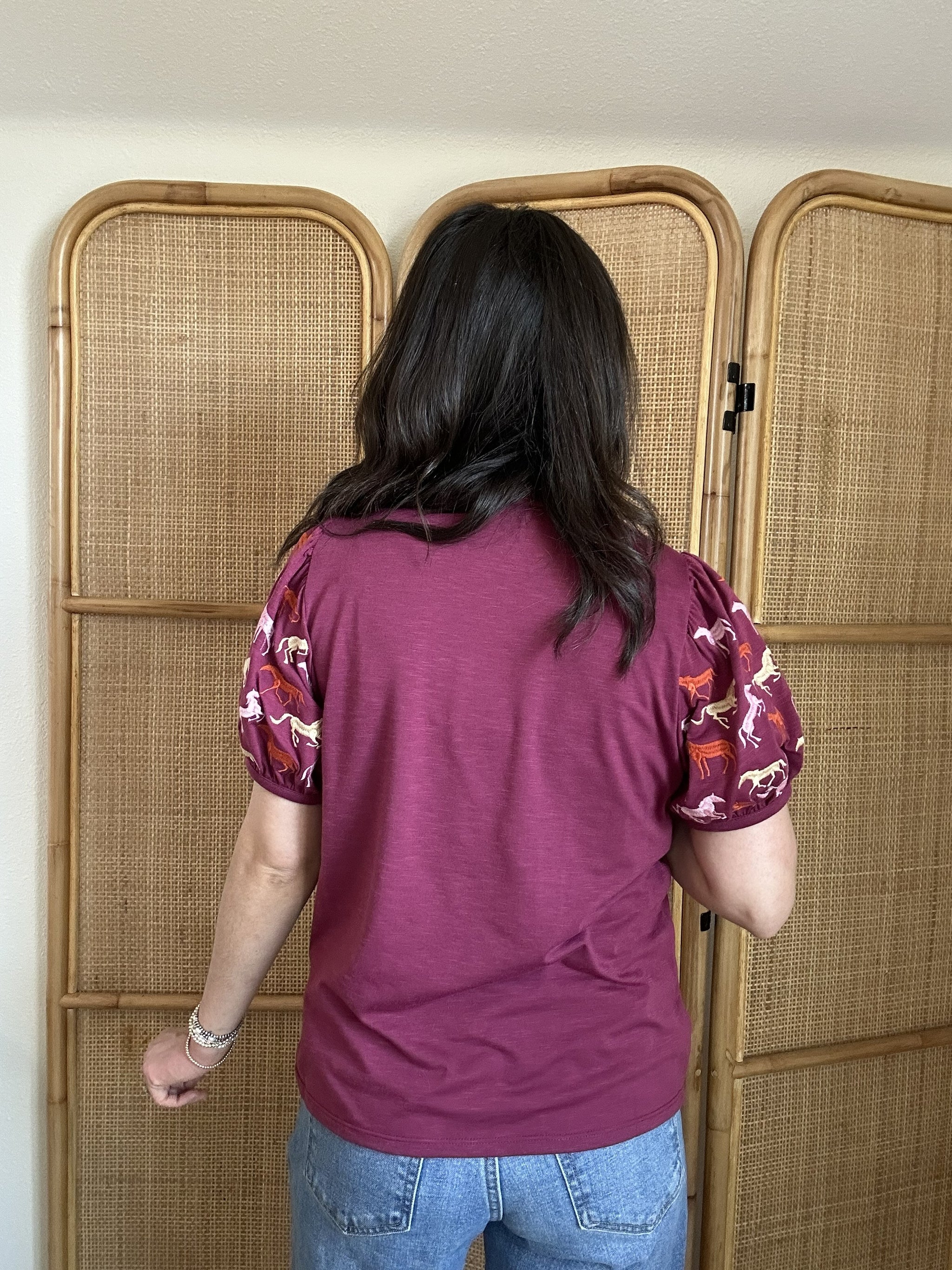 Bold, beautiful, and absolutely adorable, the Wild Horses Top is a must-have for anyone who loves western style with a unique twist. This stunning eggplant-colored top features charming embroidered short sleeves adorned with horses, adding a playful and eye-catching detail. With a classic round neckline and comfortable fit, it's perfect for making a statement while staying comfortable all day long. Pair it with denim for a casual rodeo look or dress it up with your favorite skirt!